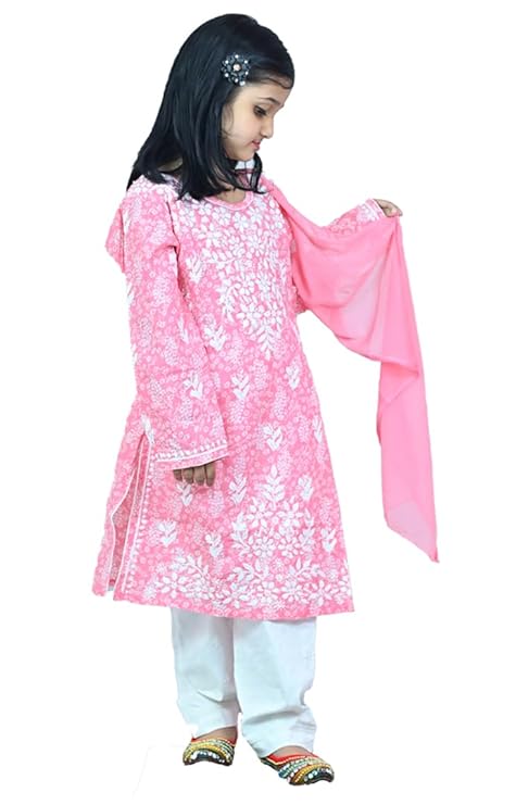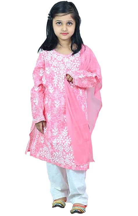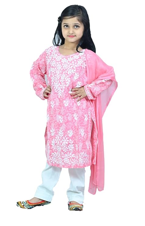 A charming pink chikankari kurta set for girls, featuring delicate white thread embroidery and paired with comfortable bottoms and a matching dupatta.