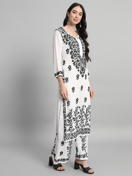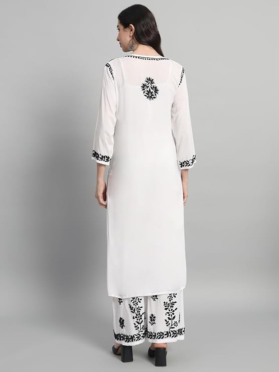 This elegant white cotton chikankari kurta set is crafted to bring comfort and sophistication together. The kurta features rich black floral thread embroidery throughout the front, sleeves, and borders, giving it a striking handcrafted appeal. Paired with matching embroidered palazzo pants, the set offers a breezy, relaxed fit made from pure, breathable cotton—perfect for all-day wear.