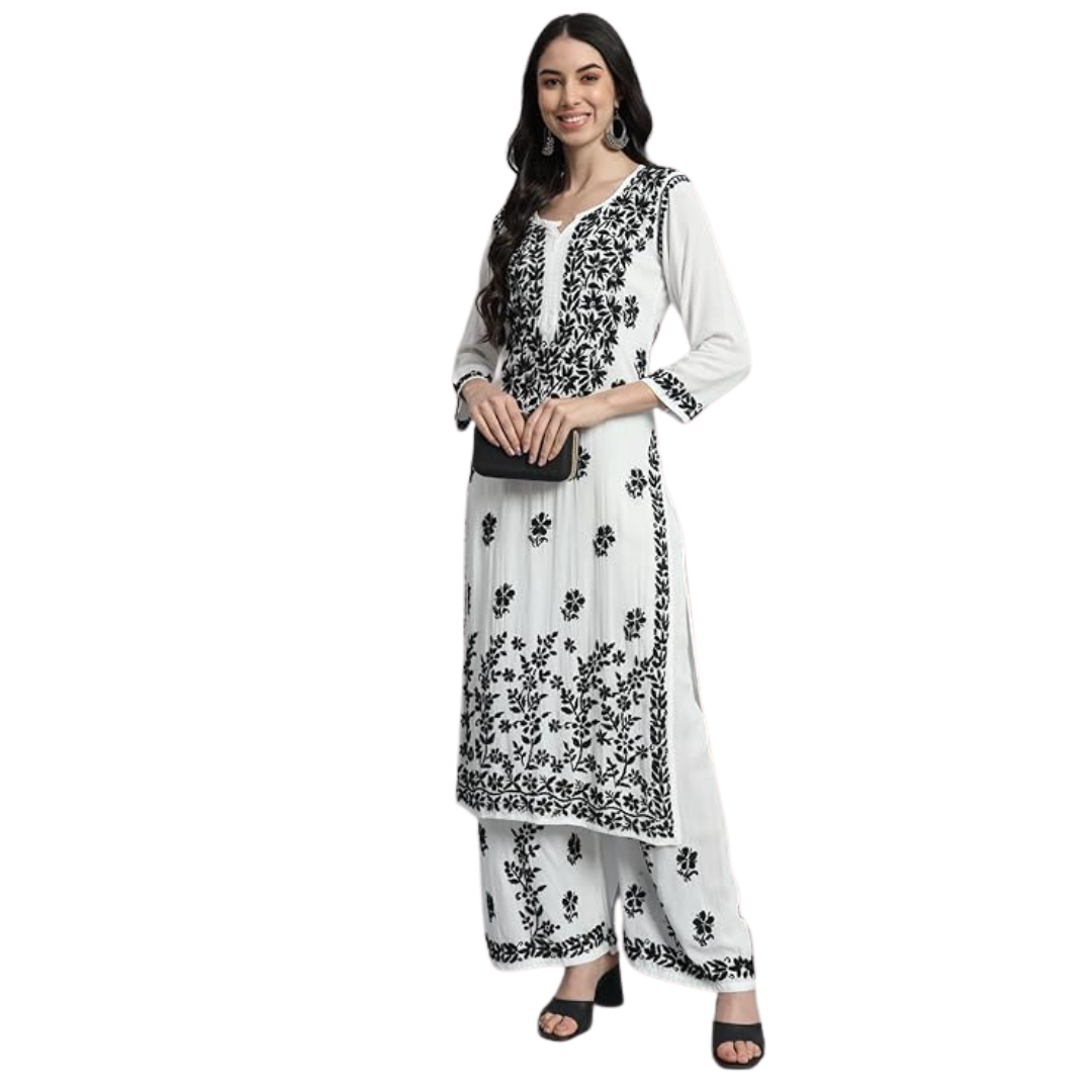 A premium white cotton chikankari kurta set beautifully adorned with black thread floral embroidery.